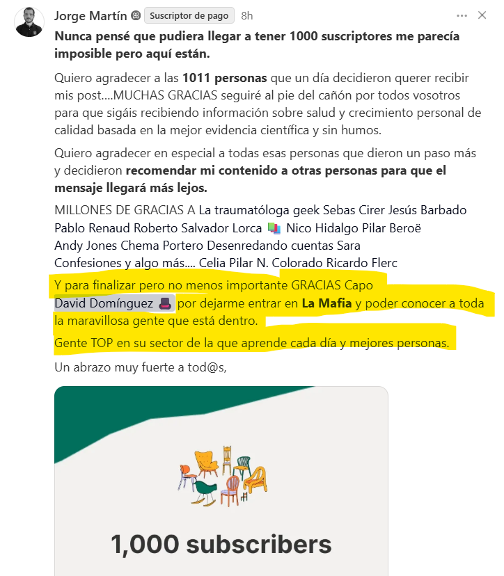 Que te presente inmediatamente, tal cual entres, en el Chat Privado de Substack Mafia para que el resto de miembros (somos unos 65) te inviten en ese mismo momento a participar en sus Lives, newsletters y otro tipo de colaboraciones valiosas... que se traducen en que tu crecimiento se dispare en cuestión de horas.