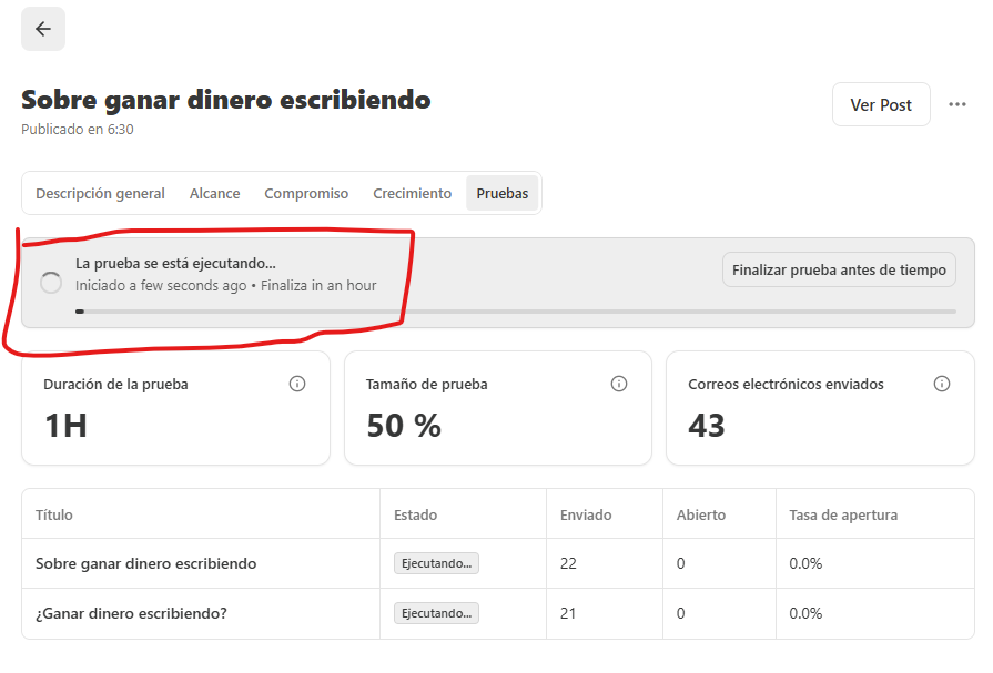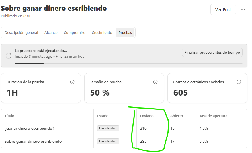 En el A puse el asunto principal (lo escribí sin saber que esta funcionalidad nueva existía), y en el asunto B creé una versión alternativa, pero cuyo mensaje es prácticamente el mismo, aunque añadiendo interrogantes.